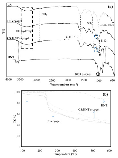 The FT-IR spectra of CS, CS cryogel, HNT, CS: HNT cryogel composites were illustrated in Figure 2a. The FT-IR spectrum of CS has a hydroxyl group at 3369 cm−1 and the symmetric NH-stretching at 2928 cm−1, aliphatic C-H at 1608 cm−1, C=O at 1560 cm−1, 1230 cm−1 for O-SO3 group and a carboxyl group at 1061 cm−1 peaks matched with the references [31]. The FT-IR spectrum of CS cryogel have OH stretching vibrations between 3300 and 3100 cm−1, asymmetric stretching of free carboxylate groups at 1605 cm−1, and S=O stretching from DVS at 1113 cm−1 wavenumbers. The FT-IR peak of HNT has peaks for Si-OH stretching at 3693 and 3620 cm−1, and for Al-OH bending at 907 cm−1, and for Si-O-Si stretching at 1003 and 791 cm−1 wavenumbers. Additionally, the FT-IR spectrum of CS: HNTs composite cryogel also has shown peaks for both CS and HNTs, such as peaks at 1610 cm−1 wavenumbers for CS cryogels, and peaks at 3693 and 3620 cm−1 wavenumbers from HNTs.