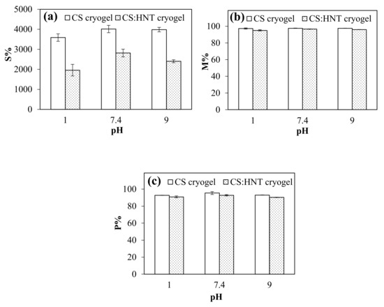 Swelling ability, moisture content and porosity of CS cryogel and CS:HNT cryogels were determined at pH 1.0, pH 7.4 and pH 9.0 buffer solutions, and the results are presented in Figure 3a–c, respectively. As seen from Figure 3a, the higher maximum swelling behaviors were obtained for of CS cryogels, 3587 ± 186%, 4014 ± 184%, and 3984 ± 113%, at pH 1.0, pH 7.4 and pH 9.0, respectively, and the maximum selling % values of CS:HNT cryogels were determined as 1961 ± 288%, 2816 ± 192, 2405 ± 73%, respectively, under the same conditions. The acidic group ionization is higher at higher solution pHs; the higher s% values for CS and CS:HNT cryogels were expected.