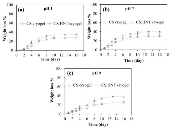Hydrolytic stability is a crucial parameter for materials to be used in biomedical applications. To determine hydrolytic stability of CS and CS:HNT cryogels, the degradation behaviors at three different pH conditions such as pH 1.0 (about gastric conditions), pH 7.4 (physiological conditions) and pH 9.0 (about intestine conditions) were investigated at 37.5 °C. The weight change in CS and CS:HNT is presented in Figure 4a–c at pHs 1, 7.4 and 9, respectively. Irrespective of the pH condition, CS and CS:HNT cryogels were found to degrade almost linearly up to 6 days, and the degradation process continued slowly up to 16 days until a plateau region was reached. As seen in Figure 4a, the first rapid degradation process of CS and CS:HNT cryogels at pH 1.0 results in a weight loss of 25 ± 4% and 19 ± 1%, respectively, after 6 days. Additionally, then the degradation process continued slowly, and after 16 days, it increased to about 35 ± 1% and 28 ± 1% for CS and CS:HNT cryogels, respectively.