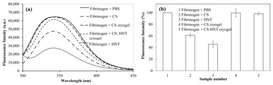 Fibrinogen is a blood protein [32], and it plays a significant role in the blood clotting mechanisms. One of the mechanisms is the conversion of soluble fibrinogen to insoluble fibrin that forms a hemostatic clot [33]. There is also a linear relationship between the change in the structure of fibrinogen and coagulation [32], and fibrinogen has a fluorescence property due to the tryptophan residues in its structure. CS and CS-based cryogel samples at 1.0 mg/mL concentration in PBS interacted with a fibrinogen solution (0.2 mg/mL), and the change in fluorescence intensity was observed. In Figure 6, the fluorescence intensity of fibrinogen upon interacting with various CS-based samples is shown. As seen in Figure 6a, the fibrinogen has a fluorescent emission peak at 341 nm with an excitation wavelength of 280 nm. When fibrinogen interacted with CS samples, the peak intensity at 341 nm was reduced and the calculated reduction as a percentage in the fluorescent intensity is given in Figure 6b. The fluorescence intensity of fibrinogen upon interacting with CS samples was listed as CS cryogel > CS: HNT cryogel > CS > HNT. In the fibrinogen interaction of CS cryogel and CS: HNT cryogel, the percentage of fluorescence intensity was determined as 99.6% and 98.3%, while 61.1% and 45.7% fluorescent intensities with CS and HNT, respectively, were observed. So, CS cryogel has almost no effect on the fluorescence of fibrinogen, while CS and HNT greatly reduce the fluorescence of fibrinogen. Therefore, the CS-based cryogels seem more suitable for conditions where arterial and venous materials or clots are not desired.