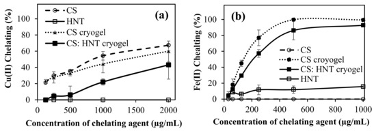 Cu(II) and Fe(II) ions’ chelating capability of CS-based cryogels were studied. The chelating capacity of Cu(II) ion and Fe(II) ion was given as the percentages of metal-chelating in Figure 7a,b, respectively. As can be seen, the Cu(II) chelating capacity was the highest, with linear CS, and it increased with concentration. It was also determined that at 2000 µg/mL concentration, CS chelated 67.5 ± 1% of Cu(II) ions, whereas the CS cryogel and CS:HNT cryogel at the same concentration showed the Cu(II) chelation capability of 60.1 ± 12.5, and 43.2 ± 17.5%, respectively. Interestingly, HNT did not show any Cu(II) chelation capability at any of the concentrations, justifying the reduction in CS:HNT cryogel Cu(II) ion binding. It was reported that D-penicillamine: (S)-2-amino-3-mercapto-3-methylbutanoic acid, Tetrathiomolybdate, triethylenetetramine dihydrochloride, 5,7-Dichloro-2[(dimethylamino)methyl]quinolin-8-ol, and 2,3-Dimercaptosuccinic acid are some of the Cu (II) chelators [34]. All these chemicals contain functional groups such as -OH, -SH, and N-containing structures. These functional groups can readily chelate with Cu(II) ions. In CS, there are plenty of -OH and -SO3H exist, which can participate in chelating with Cu(II) ions. The lesser extent of chelation capability of CS cryogel than CS polymer can be explained with the existence of some DVS groups coming from the crosslinker that may reduce the chelation capability of CS cryogels.