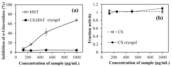 As shown in Figure 8a, CS:HNT inhibited only 4.4 ± 5.0% of enzymes at 1000 µg/mL concentration, while HNT inhibited 67.7 ± 0.6%. On the other hand, CS and CS cryogel, did not inhibit α-glucosidase at any concentration up to 1000 µg/mL, as can be seen in Figure 8b, in which the fraction activity is about 1. So, it is obvious that the enzyme activity was stimulated by CS in any formulation. Some compounds that consist of phenolics can inhibit the α-glucosidase enzyme, while some do not [39]. For example, rosmarinic acid was shown to inhibit the α-glucosidase enzyme whereas, some phenolic compounds, such as naringin and rutin, did not inhibit α-glucosidase [5,42,43]. Additionally, acarbose has a sugar unit (e.g., linked glucose) used as α-glucosidase inhibitor standard, whereas CS also has a sugar unit, and it can not inhibit α-glucosidase. The inhibitors block α-glucosidase enzyme activity by completely blocking access to its active site. In this study, it was assessed that CS did not block the active ends of α-glucosidase. In some glucose storage diseases, the body becomes incapable of converting glycogen into glucose [44,45]. An acid alpha-glycoside deficiency causes pompe disease, which is triggered by glycogen build-up in the cells. Biochemical reactions in the body are activated by these enzymes. In a healthy person with normal enzyme activity, the function of this enzyme is to destroy the complex sugar melodies stored in lysosomes in cells. Therefore, insufficient or defective enzymes cannot eliminate the complex sugar molecules, so storage occurs [46]. Therefore, the presence of CS and CS cryogel does not affect the fractional activity of α-glucosidase and can be used in such applications.