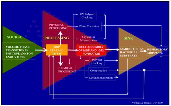 Before their release to SW, MBP are held inside phytoplankton secretory granules. They are gels stored in a condensed phase inside the cell. Upon export from the cell by exocytosis they undergo typical polymer gel phase transition to solvated phase with massive swelling. They are finally released as loosely woven physical hydrogels. Once discharged to SW, MBP can separate, disperse broadly to join the dissolved organic matter (DOM) pool. While in the DOM pool, MBP can undergo multiple physical or chemical processes. Among those, self-assembly is the one that results in the formation of MGs. Marine gels contain 10