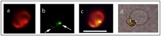 Fluorescence images of Phaeocystis globosa taken with excitation at λex = 494 nm wavelength that induces emission of both chlorophyll in the chloroplast, that fluoresces bright red (Panel a), and of the secretory granules labeled LysoSensor—a probe that binds specifically to secretory granules—that fluoresces in green. The green granules indicated by arrows (Panel b) are almost at the limit of resolution of the optical microscope. A few can be distinguished individually, and most of them—like in this case—are clustered inside the cell. Panel (c) is the merged image of (a) and (b). Depending on [Ca2+] and pH in SW, the dimensions of the swollen exocytosed MBP matrix (Panel d) can vary from ~3–12 μm. Bar = 8 μm.