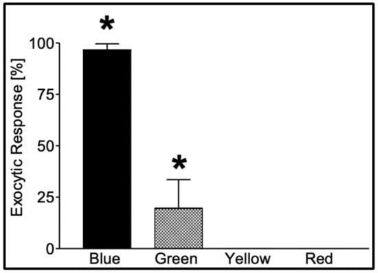−1 of blue light (λ = 450–490 nm) for 60 min induced secretion in 97 ± 2.9% of the cells, while similar exposure (*) to green light (λ = 500–540 nm) resulted in secretion in only 20 ± 14% of the cells. Exposure to equal time/fluxes of yellow (λ = 560–600 nm) and red (λ = 640–720 nm) light fails to induce secretion. Bars correspond to the mean ± SEM of five measurements [