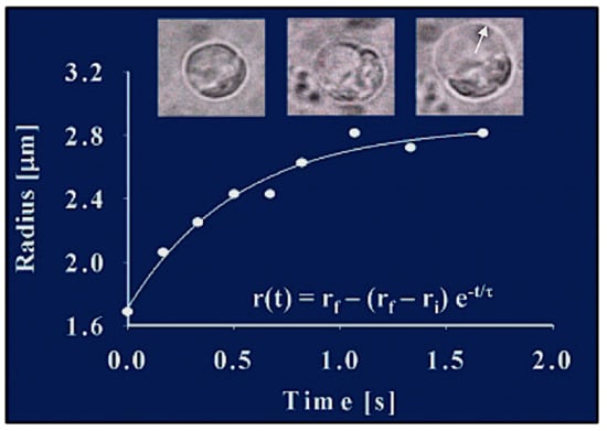 The radial expansion (arrow) of the exocytosed granules follows characteristic first-order kinetics, lending the process to be formalized and evaluated in light of Tanaka’s theory of swelling of polymer gels [