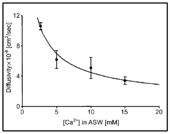 Experiments conducted in Phaeocystis equilibrated in artificial seawater (ASW) containing increasing concentrations of Ca result in a characteristic power-law decrease of the diffusion of the exocytose Phaeocystis gel. Point corresponds to the mean ± SEM of seven measurements.