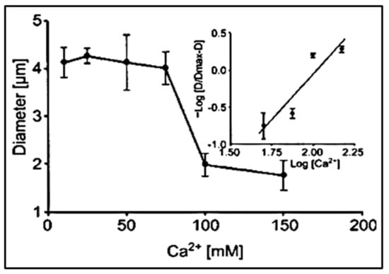 The diameter of swollen exocytosed gels—equilibrated in a pH 3 buffer solution—changes drastically as [Ca