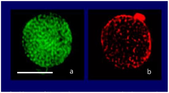 Confocal image of a secretory granule of Karenia brevis demonstrating colocalization of LysoSesor green—that labels secretory granules—in (a) and a fluorescent anti-brevetoxin antibody conjugated with Tetramethyl Rhodamine Isothiocyanate that emits in red (b). Bar = 10 μm.