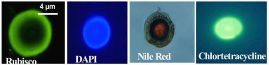 Fluorescence images show that marine gels contain a broad variety of biopolymers, including rubisco—a protein, labeled with a fluorescent specific antibody—nucleic acids—labeled with DAPI—hydrophobic moieties, probably lipids—labeled with Nile Red—and polyanionic polymers that bind Ca—labeled with CTC (Chlortetracycline).