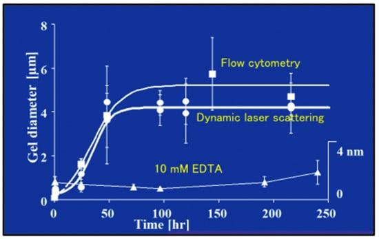 The Time course of DOM biopolymer assembly and MG formation is monitored by measuring particle size by both homodyne dynamic laser scattering (DLS), and by flow cytometry in 0.2 µm-filtered SW. Measurements of microgel size by flow cytometry (squares) and DLS (circles) show a similar time course of assembly. MG size grows from colloidal, submicrometre size, to several micrometers following characteristic second order kinetics. Control samples in which MBP assembly was inhibited by chelating Ca2+ by adding 10 mM EDTA to the SW gave an average size of 1–2.5 nm, regardless of the time of observation (triangles). Each point corresponds to the average ± SD. of five measurements.