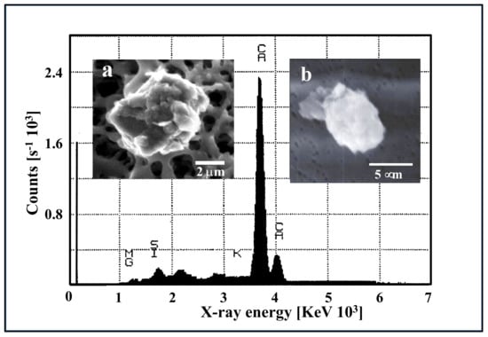 Electron probe microanalysis reveals that MGs contain substantially higher levels of Ca than Mg. Notice, that probably resulting from the Donnan partition, Ca reaches much higher concentrations inside self-assembled MG than in SW. Inset (a) is an environmental scanning electron micrograph image of a MG, the background depicts the surface of a filter—notice that this gel is intact and fully hydrated as environmental scanning electron microscopy (ESEM) does not require fixation or any other artifact-inducing chemical manipulation. Inset (b) is a gel labeled with CTC, a fluorescent probe that labels bound Ca and that, unlike other colorimetric probes, does not produce crosslinking of MBP or affect in any way the supramolecular structure of gels.