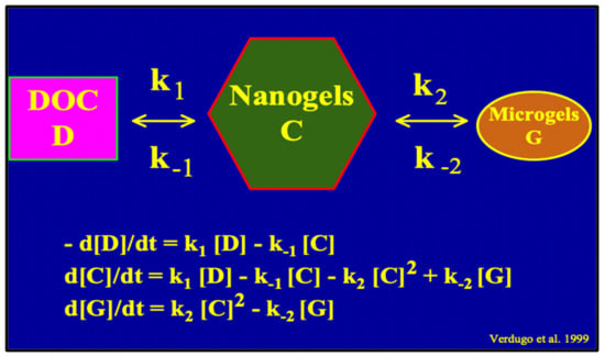 2 to the assembly reaction. Square parenthesis refers to Carbon concentration in each of the subsequent steps from DOC to Nano and MGs. From the MG step, organic carbon becomes available to microorganisms, and flux becomes irreversible as carbon enters the food web escalator (
