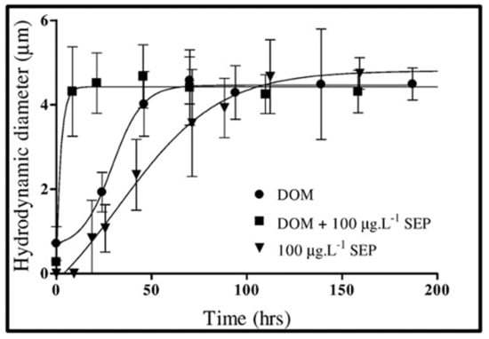 Assembly kinetics of DOM polymers in 0.2 μm-filtered seawater (circles) and self-assembly of SEP (100 μg × L−1 in ASW (triangles) monitored by DSL. Addition of 100 μg × L−1 to 0.2 μm-filtered seawater results in quick DOM assembly that reaches equilibrium in ~10 h yielding microgels of ~4–5 μm hydrodynamic diameter (squares). Points are the average ± SD of 15 outcomes of triplicate measurements in five samples.