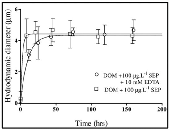 Kinetics of self-assembly of DOM polymers induced by adding 100 μg × L−1 SEP to 0.2 μm-filtered seawater in the absence (open circles) or presence of 10 mM Ca2+ chelator EDTA (open squares) does not exhibit significant statistical differences. Points are the average ± SD of 15 outcomes of triplicate measurements by DSL in five samples.