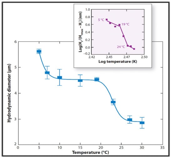 Measurements of MG hydrodynamic diameter by Photon Correlation Spectroscopy show that MG exhibits a two-step temperature-induced phase transition, with critical points at ~7 °C and between 20 °C and 25 °C. Inset. The Hill coefficients in both cases exhibit values that portray the typical high cooperativity of critical phenomena. Each point corresponds to the average ± SD. of five measurements.