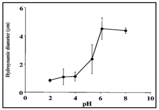 pH-induced phase transition of MG. Notice that this transition occurs within the same range as the expected pKa (4.5–5) of carboxylic groups of DOM. Each point corresponds to the average ± SD of five measurements.