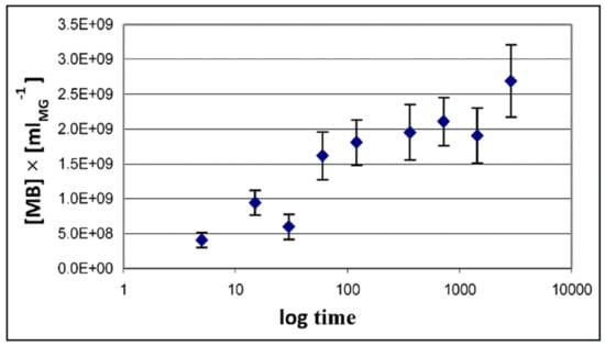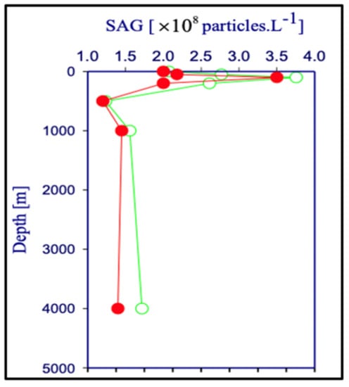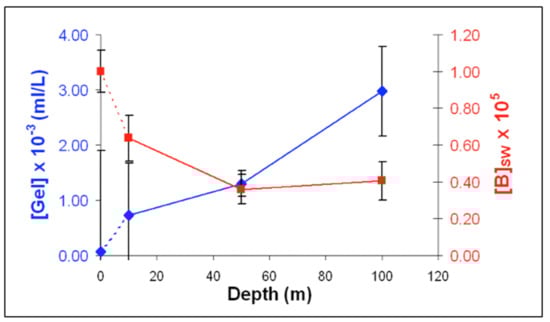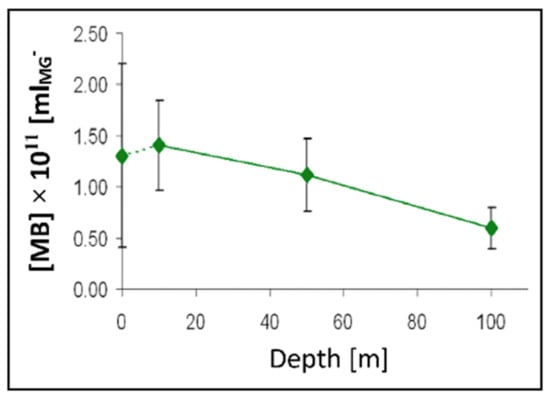 The concentration of [MB]MG lodged inside MG ranged from 0.6 to 1.4 × 1011 MB × mL−1 SW. It is more than five orders of magnitude higher than the concentration of free [MB] in SW. Points are the average ± SD. of 72 sections in 12 microgels collected in each of two samples per depth.