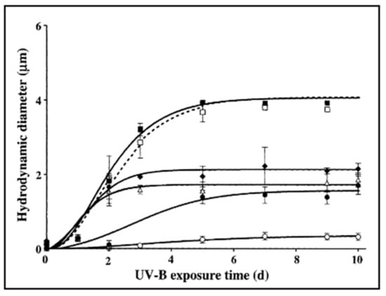 In these experiments, six aliquots of 0.2 μm-filtered SW were UV irradiated for a progressively longer time, and then DOM was set to self assemble under continuous monitoring of particle size Dynamic Laser Scattering. Control not irradiated DOM (filled squares) or irradiated for 24 h at 10 W m