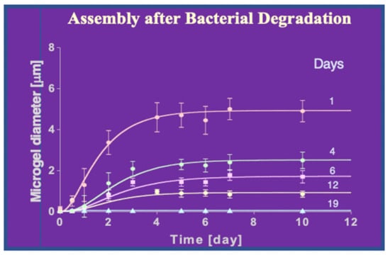 2]. However, as UV polymer cracking of DOM polymers increases with time of exposure to UV-B, DOM assembly and gel formation slow down, equilibrium size of the microgels size decreases, and finally, assembly virtually fails in DOM exposed to UVB for 12 h. Data points correspond to the mean ± s.d of 30 DSL measurements.