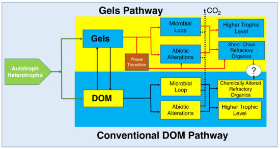 Molecular reduced-organic-carbon-carriers probably have multiple ways to move up through the marine consumer’s conveyor. Two hypothetical pathways are illustrated here; one that postulates that DOM becomes directly available to marine bacteria primarily based on their molecular weight. The other proposes that bacteria feed primarily in marine gels made of large HMW moieties. According to the DOM hypothesis, the pass for moieties to become refractory is by potential chemical alterations that make these molecules resistant to bacterial enzymes. The Gel pathway hypothesis postulate that, while there are chemically altered species in SW, refractory molecules are simply those too large to be metabolized by bacteria and too small to self assemble. Implicit in this statement is the notion that marine gels are necessary and probably sufficient to drive carbon flux dynamics in the ocean.