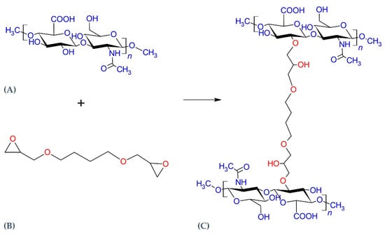 Schematic illustration of cross-linking reaction between hyaluronic acid (HA) (A) and the (1,4-butanediol diglycidyl ether) BDDE cross-linking agent (B). Under alkaline conditions the BDDE epoxy groups react with the hydroxyl HA group, leading to ether bond formation (C). Image obtained with ChemSketch 2020.1.2 (Advanced Chemistry Development, Inc., Toronto, CA, Canada).