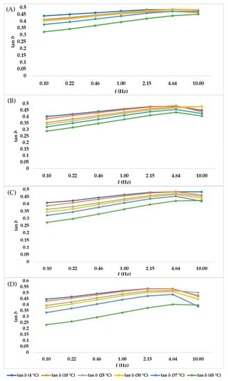 Cross-linked HA hydrogels graphical representation of the tangent of phase angle in order to summarize the trend of G’ and G’’, with tan δ given by the ratio of G’’/G’. (A–D) are graphical representations of the cross-linked HA 28, 26, 24 and 22 mg/mL trends, increasing frequency.