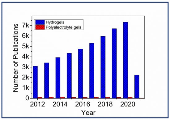 Number of publications over the past ten years by searching “Hydrogels” and “Polyelectrolyte gels” in Scopus on 27 March 2021.
