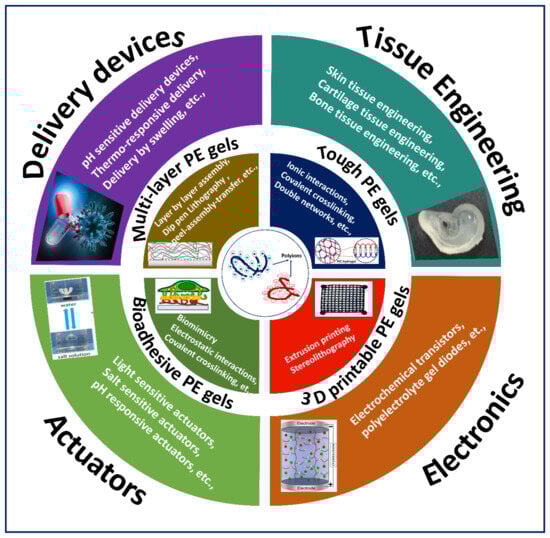 PE gels feature several advantages such as excellent tuneability, biocompatibility and stimuli-responsive properties. PE gels further offer the tuneability of cellular activities such as adhesion and proliferation by exploiting the cell–gel interactions []. Therefore, to exploit the excellent characteristics offered by PE gels, different types of demanding PE gels (Table 1 in Section 3.4) are fabricated for diverse applications.