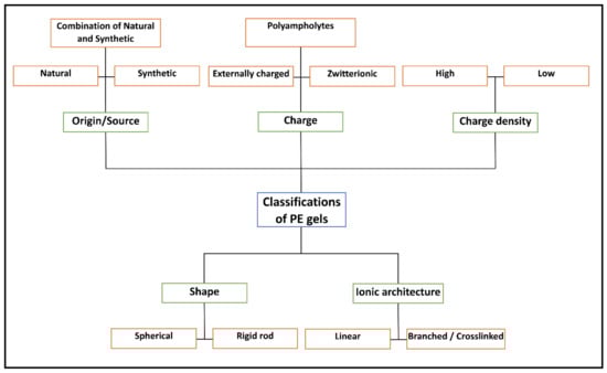 PE gels are predominantly classified based on their origin, commonly developed by using natural, synthetic or, in some cases, a combination of both for PEs to utilise the properties obtained from both sources. However, with a multitude of PEs to select from, further classifications are observed, such as charge, charge density, shape and ionic sites’ location, as presented in Figure 3.