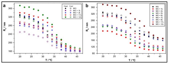Temperature variations have been shown to influence the growth of PEMs as well as additional properties post-assembly. The deposition temperature of each layer reflects on the internal interactions that occur within the complex. For instance, in one study, a positive linear correlation between an increase in thickness and temperature to a predetermined set point was found []. As gels require water content to be present, the effect of temperature is limited in the bilayers’ thickness compared to films. Specifically, exponential to linear growth in multilayers has been observed with increased temperature due to the limited polymer diffusion once the transition point is met []. However, the influence of temperature on PEMs has been shown for surface modification of thermoresponsive microgels, leading to intriguing effects [,]. Wong and Richtering [] coated PEMs (PDADMAC/PSS) onto a PNIPAM acrylic acid core and PNIPAM shell microgel, which displayed a broader lower critical solution temperature (LCST) (~36 °C) in comparison to a PNIPAM microgel with a sharp LCST at ~32 °C. The thermoresponsive nature led to both architectural and size changes in the resulting gel []. In an analogous study, the hydrodynamic radius (Rh) of a PNIPAM-co-methacrylic acid (PNIPAM-co-MAA) nanogel coated with either poly(L-lysine) (PLL)/poly(L-glutamic acid) (PGA) (Figure 5a) or CHT/dextran sulphate (DS) (Figure 5b) multilayers was compared with increasing temperature []. As seen in Figure 5, after adsorption of the first cationic layer, there is a decrease in the Rh of the gel; however, the thermoresponsive behaviour is retained. The second layer also retains the thermoresponsive behaviour; however, it displays an increase in size. Thus, an “odd–even” effect is found depending on the charge of the outermost layer. Comparing both microgels, upon the approach of the anionic PEs (PGA or DS), the opposite charges need to distribute evenly between the gel and the PE. Hence, the Rh decreases, as the pulling attraction between the gel and cation is decreased.