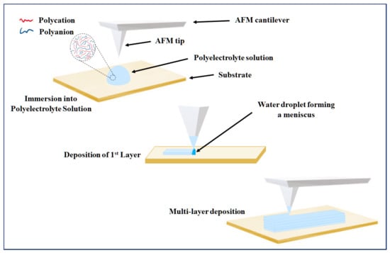 Advanced PEM assembly has been achieved through interdisciplinary approaches, where variations in nanofabrication methods associated with lithography are widely used, which enable layered patterning in a controlled manner []. Of the various lithographic methods, dip pen nanolithography (DPN) is well known and widely utilised, where several derivations of the technique have been explored [,] and are still gaining interest for use in LBL assembly. The technique incorporates the use of an atomic force microscope (AFM) cantilever tip, where it is used as a writing device to deliver the relevant chemical as an ink in a predetermined pattern, as shown in Figure 7. Despite the slow speed in patterning compared to other techniques, the attractiveness of DPN is highlighted in its ability to create arbitrary patterns, ranging in sizes and shapes on a single substrate, allowing accurate, high-spatial resolution construction of multilayers that form interactions at a nanoscale [].
