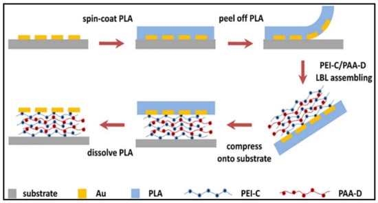 A vastly uncommon yet advanced technique used to assemble multilayers is the peel-assembly-transfer (PAT) method. The strategy behind this technique revolves around introducing polymers between plasmonic microstructures and substrates, allowing the various secondary interactions to form a strong network []. Jiao et al. [] utilised the LBL technique to develop a mussel-inspired PE using the PAT procedure to incorporate polyelectrolytic monomers (polyetherimide and poly(acrylic acid) (PAA)) into a multilayer adhesive system, as shown in Figure 8. A film is peeled off from a substrate, followed by an LBL assembly of PEMs, which are then compressed onto a substrate and dissolved to remove the film and expose the multilayer functionalities. This unique strategy resulted in an adhesive system with improved mechanical stability, morphology and optical properties through the inclusion of mussel-inspired molecules, which proved effective against rubbing and ultrasonic treatment.