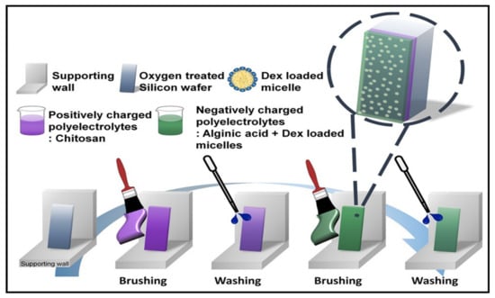 More recently, analogous to the PAT procedure, a rapid and highly efficient LBL assembly technique has been recognised as a process fabricated by a brushed layer. Compared to the conventional LBL method, the preparation of brushed LBL systems is formed through a simple process. The gel assembly involves brushing a PE solution onto a fixed substrate, followed by washing and drying through an air gun and brushing again with an oppositely charged PE, as shown in Figure 9. The steps are then repeated according to the number of bilayers required for the multilayer film required. The advantages of this method were apparent compared to the conventional method, where the technique could expose the typical conventional aspects (uniformity, morphology, thickness, etc.) and attain the ability to fabricate any pattern or shape. In addition, the method could be utilised for drug delivery purposes through site-selective deposition with different film thicknesses [].