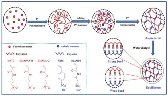 In addition to multivalent cations, Komoto et al. [] employed cationic chitosan produced using sodium hydrogen carbonate for the ionic crosslinking of ALG in the presence of d-gluconolactone (GDL) to produce a PE gel. The resulting PE complex gel demonstrated an elastic modulus of 7000 Pa and was proposed for tissue engineering and scaffold regeneration applications. Employing polycationic and polyanionic (polyionic complexes) is also an efficient way to form a tough PE gel. However, the strong interactions between bulk polycation and polyanion polymers lead to an inhomogeneous precipitation, limiting their fabrication as thin layers produced by layer-by-layer assembly. To overcome this problem, Luo et al. [] fabricated several tough PE gels by two-step polymerisation between several positively and negatively charged monomers (Figure 10). Briefly, the cationic monomer is homopolymerised and mixed with the anionic monomer and subsequently polymerised with the anionic part. The interactions between the cationic and anionic polymers lead to the formation of a PE gel with both weak and strong ionic bonds. The resulting hydrogels showed a wide range of tuneable mechanical properties, where the combination of cationic acryloyloxethyltrimethylammonium chloride (DMAEA-Q) and anionic sodium p-styrenesulfonate (NaSS) monomers resulted in a very tough gel with a Young modulus of 7.9 MPa.