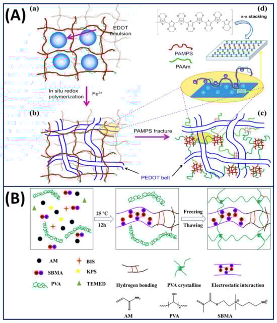 (A) Schematic illustration of the synthesis of fatigue-resistant hydrogels with self-assembled PEDOT belts through in situ polymerisation in the double-network matrix. (a,b) A parent PAMPS double-network hydrogel is used to host the emulsion of 3,4-ethylenedioxythiophene (EDOT), which is redox polymerised within the DN gel channels, leading to the formation of an entangled PEDOT belt network. (c) Upon loading, the PAMPS network fractures into fragments linked by the ultralong PAAm chains, yielding a PE network interlacing with the rigid PEDOT belt mesh. (d) The PEDOT belts are composed of self-assemblies of PEDOT chains through π–π stacking. Reprinted (adapted) from []. Copyright (2014) American Chemical Society. (B) Schematic of fabrication of self-recoverable zwitterionic PVA/P(AM-co-SBMA) DN gels. Reproduced from [].