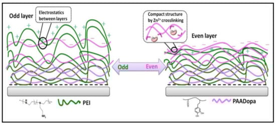 Proposed network structure of odd and even multilayers composed of PAADOPA-Zn and PEI. Reprinted from [].