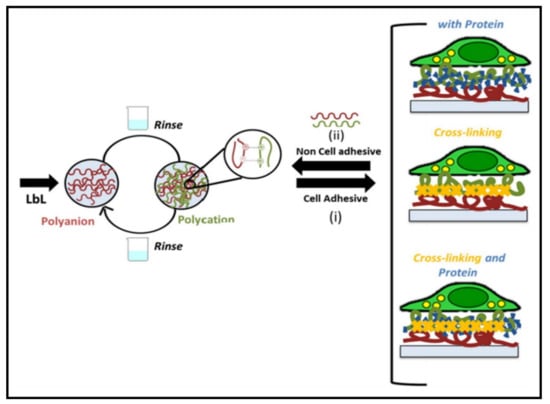 Schematic of PEs displaying electrostatic interactions, becoming either cell-adhesive or non-cell-adhesive based upon the steps used: (i) adhesive properties are gained via the addition of proteins, crosslinking or a combination of both; however, they become (ii) non-cell-adhesive if the cation (CHT) and anion (ALG) multilayers are added on top of the prior mentioned adhesive gaining steps. Reproduced from [].