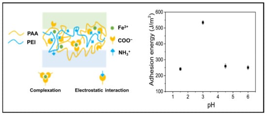 Proposed schematic of interactions of a polyelectrolytic hydrogel and the influence on the adhesion energy based on variations in the pH values of Fe3+ (adhesion time of 1 day). Reproduced from [].