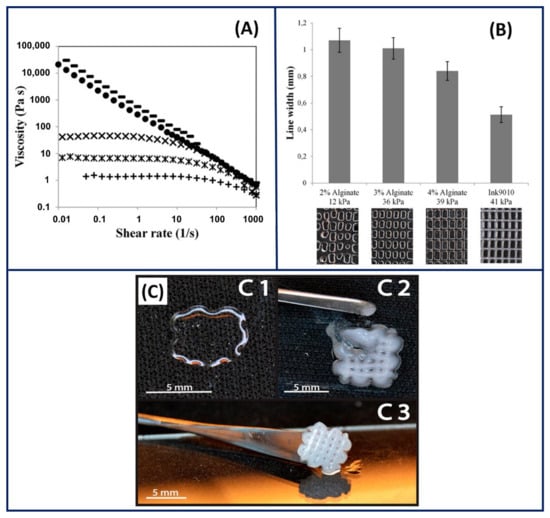 - Axpe, E.; Oyen, M.L. Applications of Alginate-Based Bioinks in 3D Bioprinting. Int. J. Mol. Sci. 2016, 17, 1976. [Google Scholar] [CrossRef]