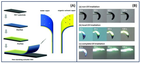 - Song, Y.; Qin, S.; Gerringer, J.; Grunlan, J.C. Unusually fast and large actuation from multilayer polyelectrolyte thin films. Soft Matter 2019, 15, 2311–2314. [Google Scholar] [CrossRef] [PubMed]