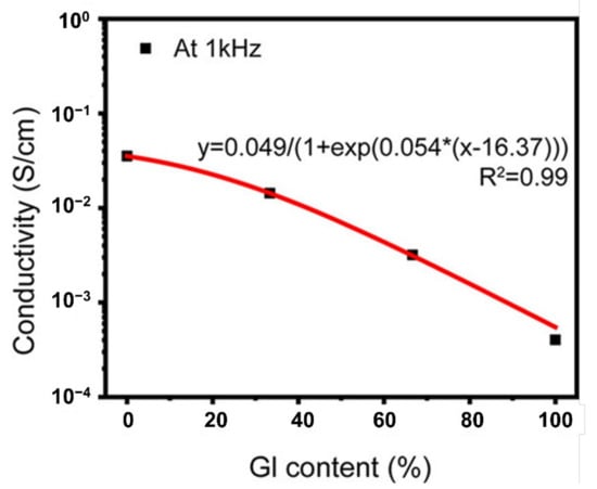 Polyelectrolytes with high concentrations present the complexity of ion–ion correlations and decreased ionic conductivity (estimated theoretically), where PE gel networks capable of holding large amounts of solvents or liquid plasticisers show excellent ionic conductivity at room temperature (Figure 4B) []. The presence of a solvent accelerates the ion and polymer segmental dynamics and provides an alternative ion transport through the liquid medium, resulting in an increased ionic conductivity in PE gels. However, the ionic conductivity in PE gels is highly complex and less understood because it depends on other factors such as the concentration, aggregation, charge density, network structure or crosslink density [,].