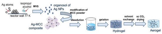 Composite hydrogels and aerogels based on microcrystalline cellulose and Ag NPs were prepared using a combination of MVS, gelation, and drying in sc CO2. To obtain gel, microcrystalline cellulose powder modified with sol of Ag NPs prepared via MVS was used as precursor. At each stage of the preparation of the cellulose-based composites, non-toxic reagents, such as isopropanol and sodium hydroxide were used. This approach seems especially promising as it reveals many new possibilities for obtaining various metal-polymer biomaterials.