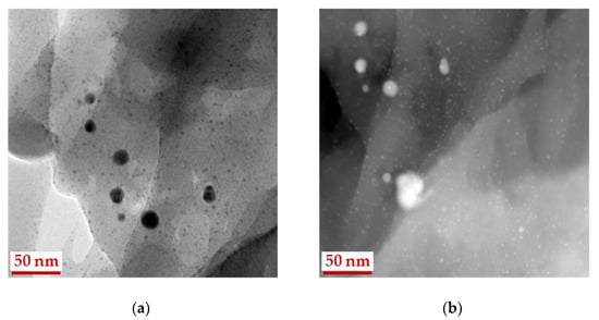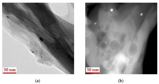 The Ag 3d spectrum of Ag-MCC composite, the precursor of the aerogel shows the noticeable asymmetry and was approximated with two Ag 3d5/2-Ag 3d3/2 spin-orbit doublets at 368.2–374.2 and 368.9–374.9 eV with ratio 1:3. The peak at 368.2 eV corresponds to bulk unoxidized silver. Taking into account the size effect in photoelectron spectra and the Ag particle size the peak at 368.9 eV may be assigned to Ag0 state as well. The greater the binding-energy shift (0.7 eV) to the high-energy region for Ag-MCC in comparison to that of Ag-AC (0.4) is associated with the decreasing of particle size in the matrix. This statement is in good agreement with the electron microscopy data. The micrograph in a dark field (Figure 3, right image) clearly shows 1.5 nm particles uniformly covering the MCC fibers. In the case of an aerogel, such particles are not visible, but particles with a diameter of 8–10 nm are observed (Figure 4).