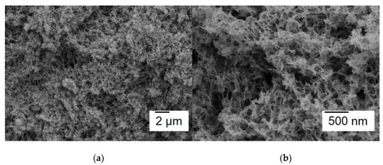 The microstructure of the gels was investigated by SEM. The cross-sections of the samples were examined. In Figure 5, micrographs of the Ag-AC aerogel are presented. As it can be seen, the aerogel has network fibrillar structure forming open pores with sizes of tens nm. Silver NPs are not visualized due to small size.