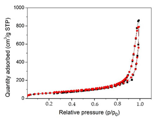 Nitrogen adsorption-desorption isotherms for cellulose-based aerogels: AC (black squares) and Ag-AC (red circles).
