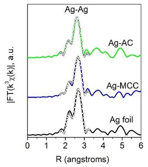 Structural information on the chemical state and local environment of silver atoms in the cellulose-based metal composites was obtained using the EXAFS method. Fourier transforms of Ag K-edge EXAFS spectra for the four Ag-modified cellulose samples are shown in Figure 9. They are dominated by a single contribution of Ag-Ag interatomic distances very similar to that observed in bulk silver reference. This means that the cellulose nanocomposites contain silver predominantly or even exclusively in the metallic form.