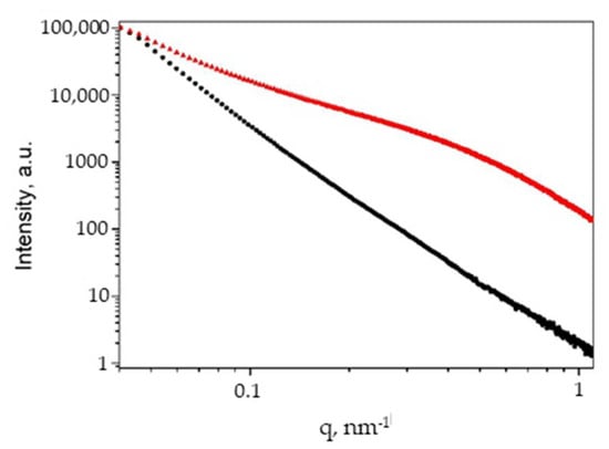 Experimental range of scattered vectors q = 0.04–1.1 nm−1 contains information on inhomogeneities of mean density (either regions of increased density or pores) within the samples over the size range 0.9–25 nm. The SAXS curve for pristine microcrystalline cellulose is presented in Figure 8, black curve. In a double logarithmic scale, it looks like a line with a slope α = −3.35. This means that the sample contains no specific structures with characteristic sizes falling into the range indicated above (0.9–25.0 nm) and thus scattering occurs in the high-q Porod’s asymptotic regime [7,52]. The scattering character is governed by rough interfacial boundaries within essentially compact matrix with a surface fractal dimension given by Ds = 6 − α = 2.65. Upon further consideration, we assume that the main scattering centers in AC are cellulose fibrils, which form a porous framework. Thus, analysis of the curves was used to determine the mean filament radii and fractal dimension, as well as to understand the general structure of the solid matrix.