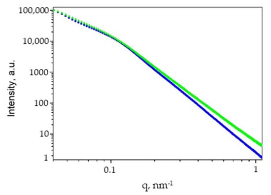 Small-angle X-ray scattering patterns in double logarithmic scale for Ag-MCC (blue triangles) and Ag-AC (green triangles).