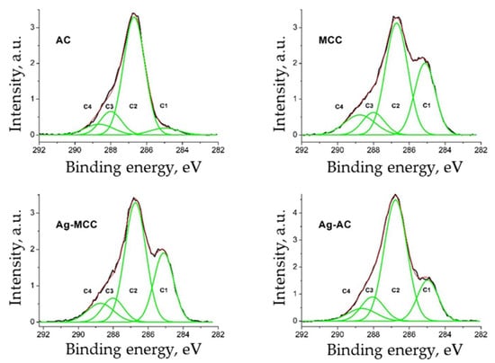 The main differences in the spectra are observed in the regions of low and high binding energies. The relative concentrations of the adventitious carbon atoms (C1 and C4) practically do not change after the deposition of Ag NPs on MCC and decrease for cellulose aerogel (Ag-AC). The transition from MCC to aerogel composites is accompanied by significant decrease of C1 concentration.